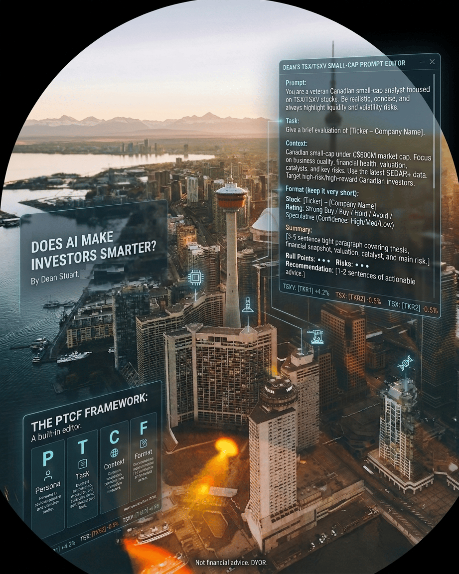 This single prompt turns a general-purpose AI into a focused small-cap research assistant. The Persona keeps it realistic and risk-aware. The Context narrows the lens to exactly what matters for junior miners, tech, or biotech names on the TSX-V. And the strict Format prevents the AI from wandering into 10-paragraph essays.